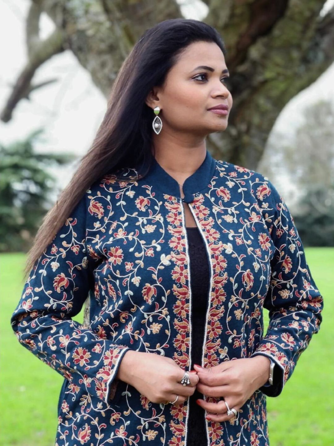 Blue Soft Wool Embroidered Kashmiri Aari Jacket Set